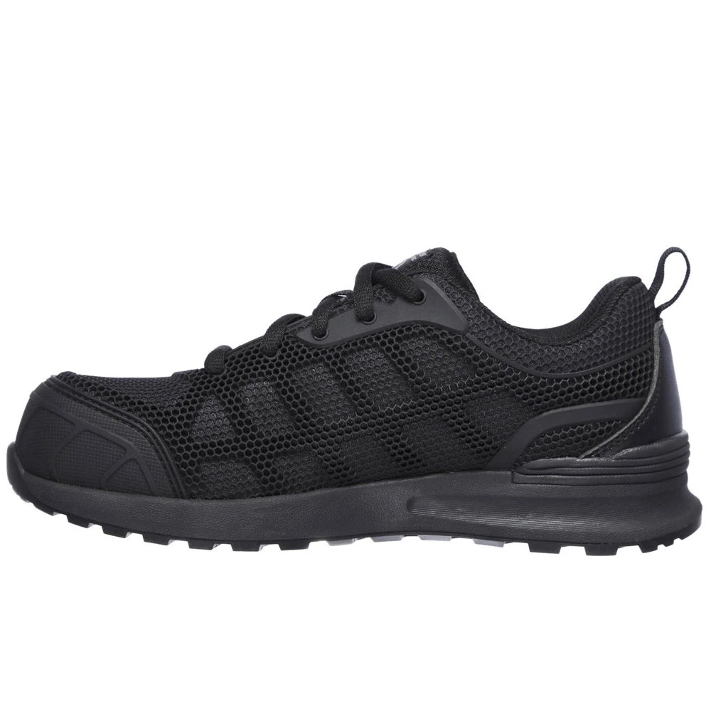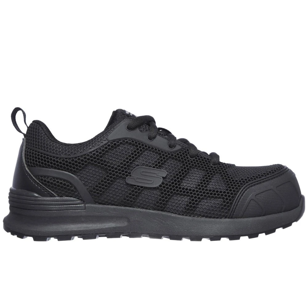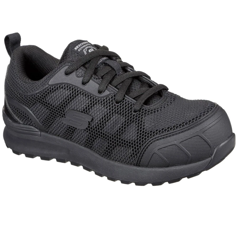 Keep protected and comfortable with sporty good looks wearing the SKECHERS Work: Bulklin – Ayak Comp Toe shoe. Smooth durable synthetic and mesh fabric upper in a lace up sporty composite safety toe slip resistant work sneaker with stitching accents.
