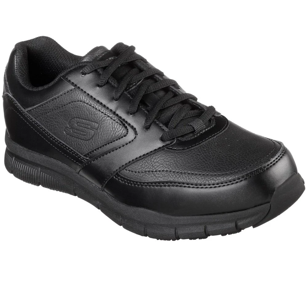 Ensure your comfort, safety and good looking style wearing the SKECHERS Work Relaxed Fit: Nampa SR shoe. Leather-textured synthetic upper in a lace up sporty casual comfort work slip resistant sneaker with stitching accents and Memory Foam insole.