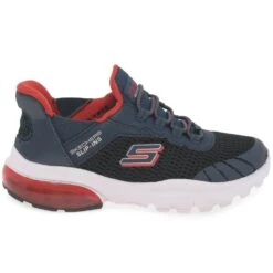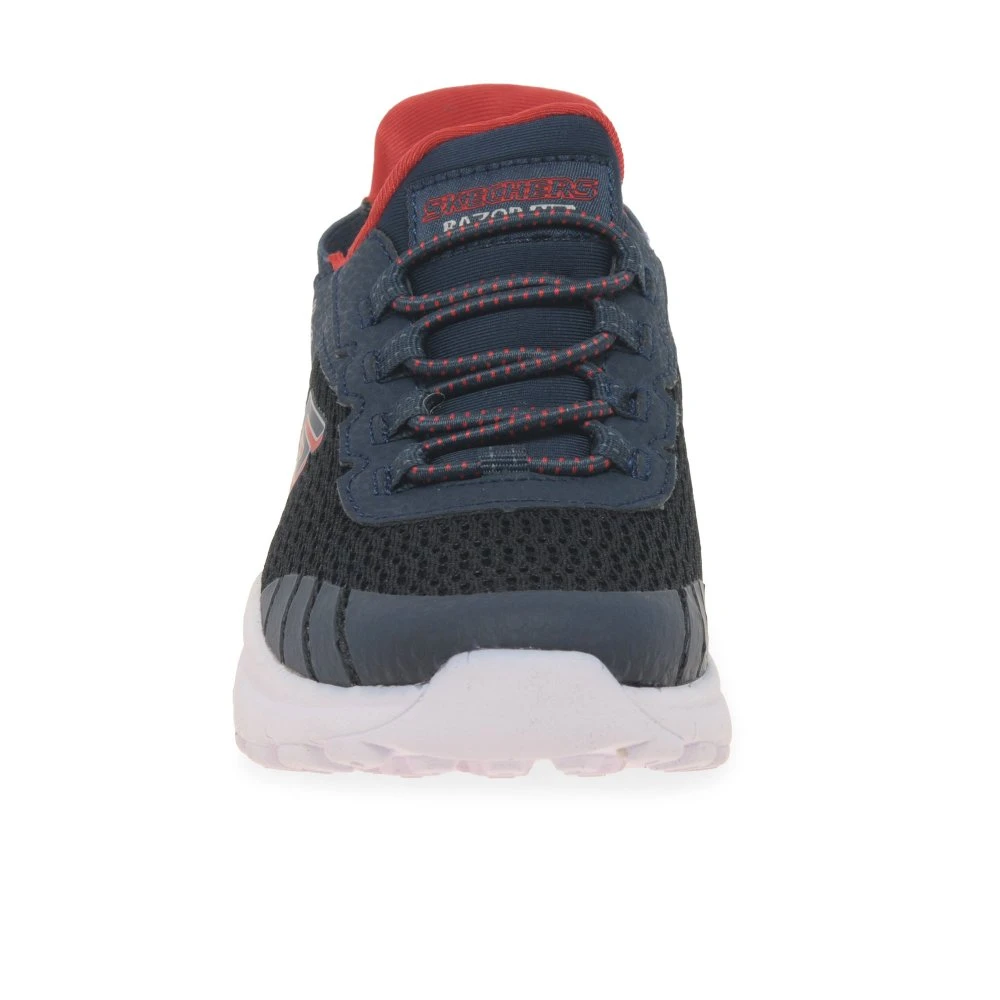 The Skechers Razor Flex Air Slip In boys sports trainers present a breathable textile upper with a man-made overlay. Hands-free Skechers Slip Ins design allows an easy on and off, whilst rip-tape fastenings keep feet secured.
