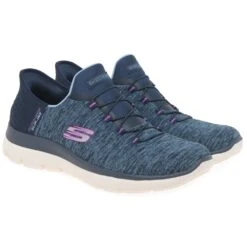 Crafted from vegan materials, the Skechers Slip In Summits Womens Trainers feature fixed stretch laces and a cushioned Skechers Air-Cooled Memory Foam insole for a lasting and comfortable fit. Offering increased ease-of-wear, their exclusive Heel Pillow design holds your foot securely in place throughout the day.