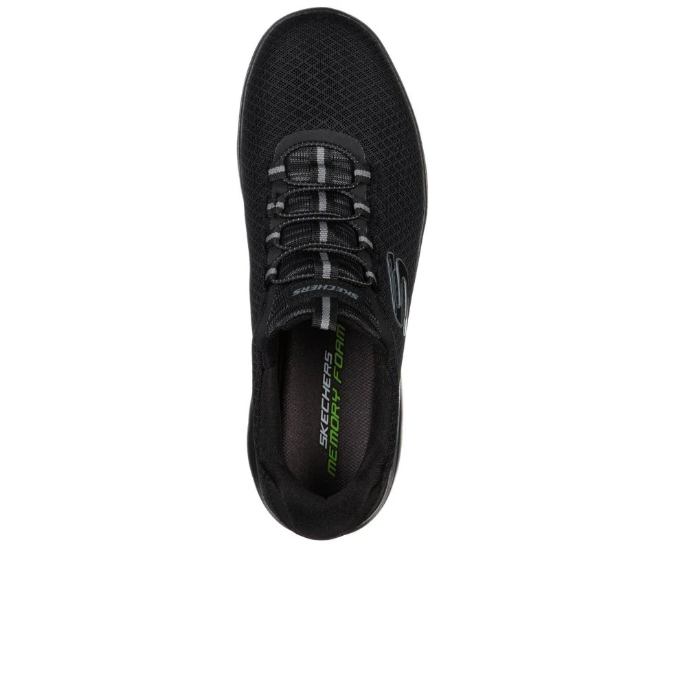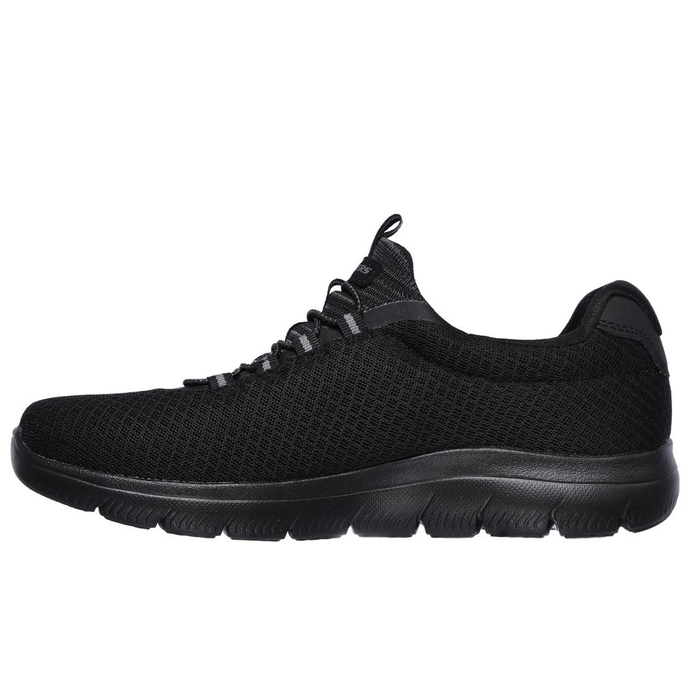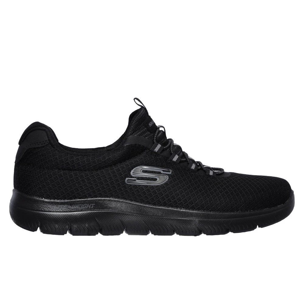 Reach the heights of sporty style and comfort with the Summits shoe. Nearly one piece soft smooth flat knit mesh fabric upper in a bungee laced slip on athletic training sneaker with stitching accents.