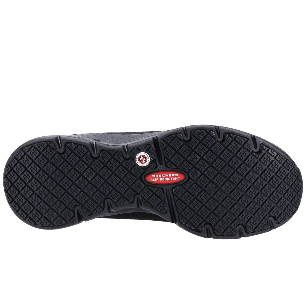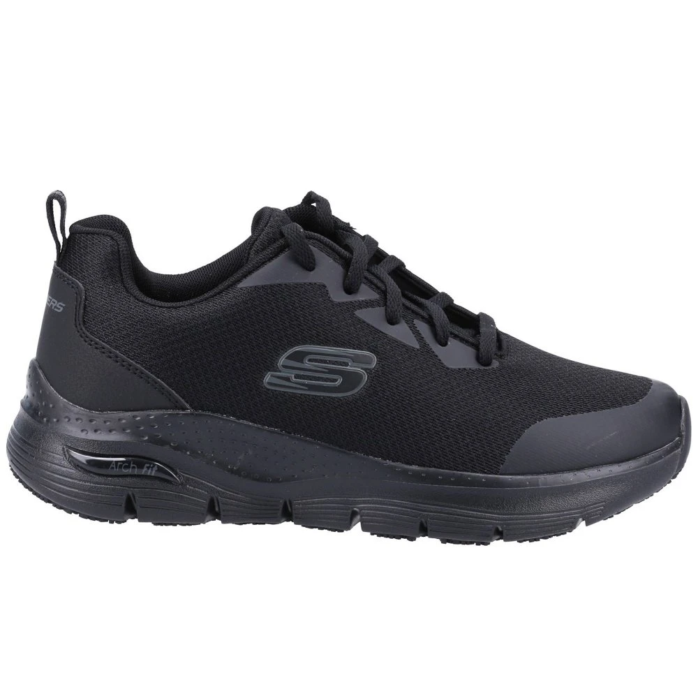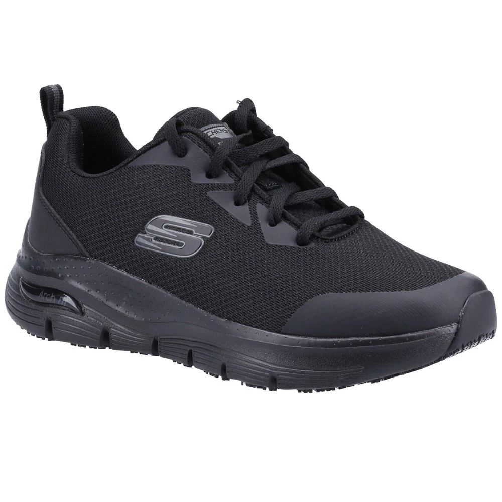 The Skechers Work: Arch Fit SR shoe offers all-day comfort and support with safety you can depend on. This slip-resistant work sneaker features a lace-up front in a durable mesh knit fabric and synthetic upper, Arch Fit removable cushioned insole.