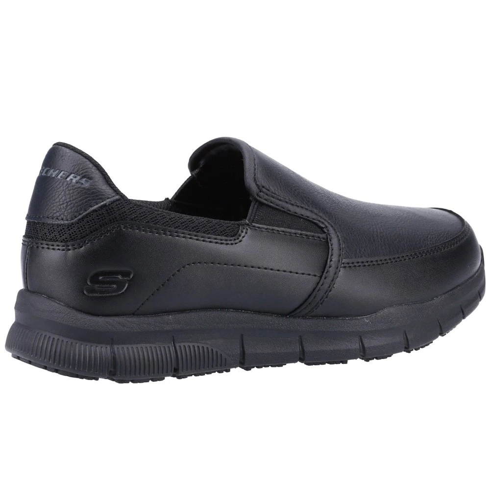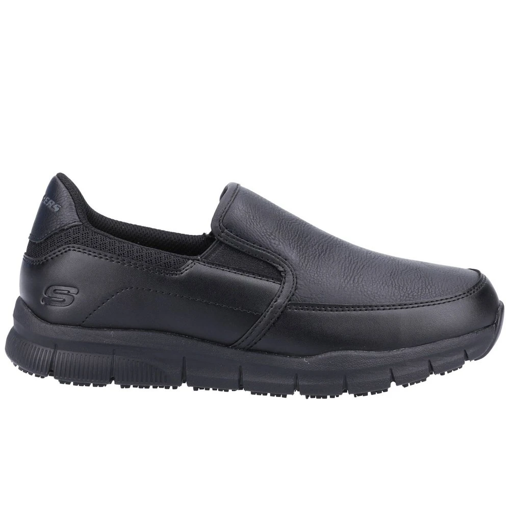 Have a comfortable and safe day every day with the SKECHERS Work Relaxed Fit: Nampa – Annod SR shoe. Smooth leather-textured synthetic upper in a slip on sporty casual comfort work slip resistant sneaker with stitching accents and Memory Foam insole.